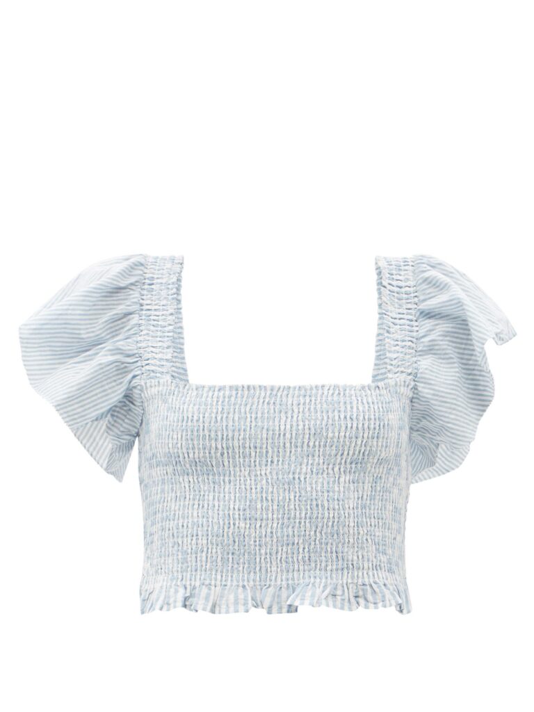 LoveShackFancy Wallace Striped Shirred Cotton Cropped Top $231