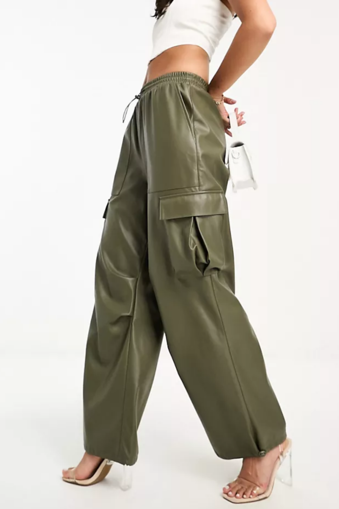 Miss Selfridge Faux Leather Baggy Cargo Pants in Khaki $60
