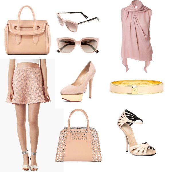 By Joyce Huang on 2013/08/26There is something about blush pink and pale pinks that is utterly romantic. Whenever you slip these items on you are going to feel elegant, sweet and angelic. Alexander McQueen Bag $2825 Topshop Skirt $70 Christian Dior Sunglasses $395 Charlotte Olympia Heels $795 Prada Embellished Bag $3700 Emilio Pucci Top $799 Vince Camuto Bangle $38 Giuseppe Zanotti Strappy Heels $477
